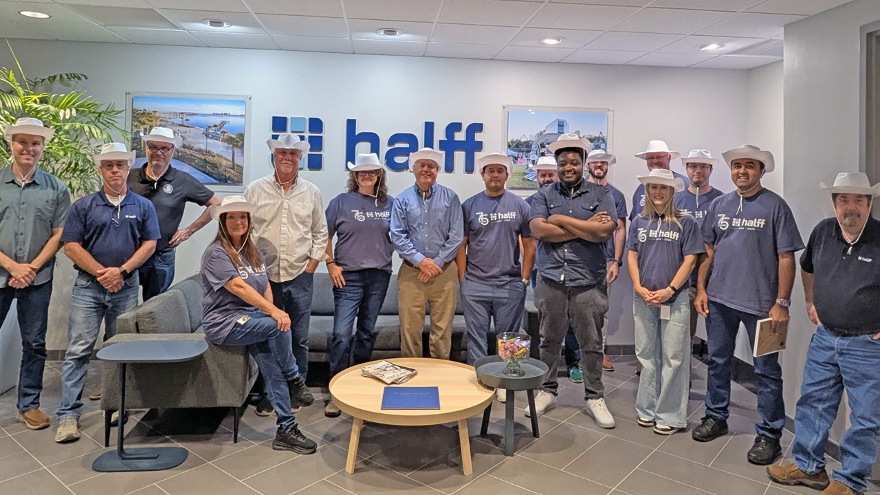 The Tallahassee office celebrated Dr. Halff’s birthday in style with their 75th anniversary T-shirts and cowboy hats.